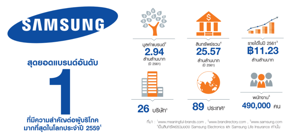 Samsung บริษัทชั้นแนวหน้าสัญชาติเกาหลีที่ผู้คนทั่วโลกรู้จัก โดยเป็น “แบรนด์อันดับ 1 ของโลก” ที่มีความสำคัญต่อผู้บริโภคมากที่สุดในโลกประจำปี 2559 มูลค่าแบรนด์ 2.94 ล้านล้านบาท สินทรัพย์รวมมากกว่า 25.57 ล้านล้านบาท
